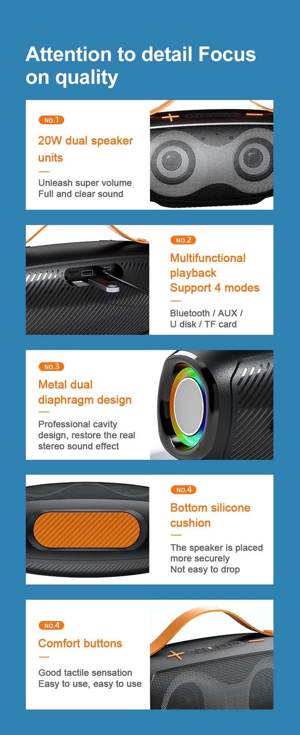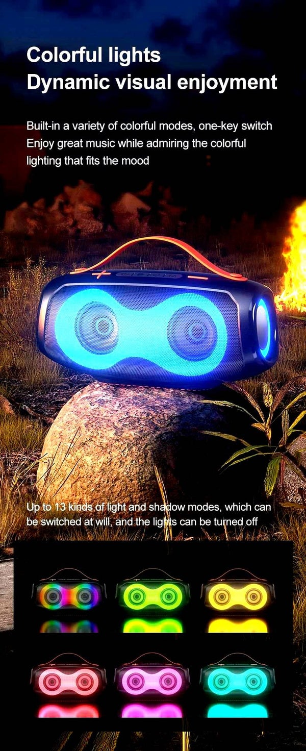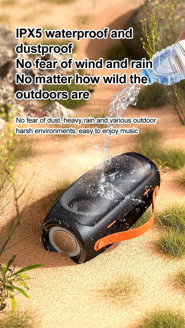 Neem overal met zijn waterdichte constructie, perfect voor buitenavonturen. Geniet van een rijke, helder geluid met een robuuste 20W-uitgang, waardoor uw luisterervaring wordt verbeterd.